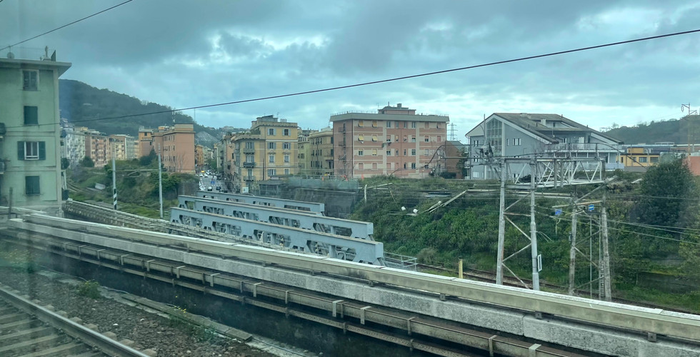 To the left, south-east, mountains start to rise & flatlands make way for ambling hills, getting larger & larger, nothing quite like Switzerland, but enough to be unable to hike through without the help of a machete, so dense was the foliage. Villages with more apartment blocks start to appear with family homes on the outskirts of villages & towns. Tunnels are passed through as we get closer to Genoa, we've got to get down from these hills to sea level.