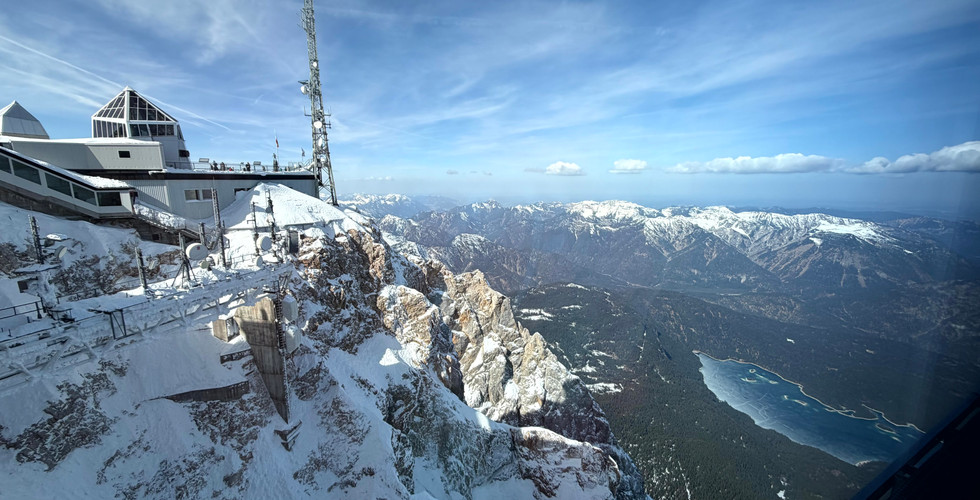 We disembark and wander around the various levels of the summit structure & find a restaurant & cafe where we purchase refreshments and take a seat overlooking the Austrian Alps which, literally, Zupspitze is a part of, but on the German side of the border, and invisible line that cuts through the summit.